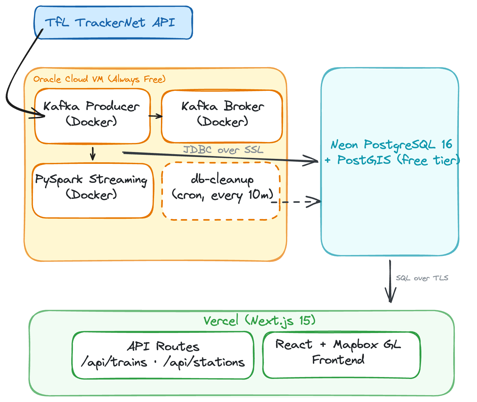 In local development, PostgreSQL runs as a Docker container alongside Kafka and PySpark. This is simple to set up locally, but in a deployed web app, we needed to split the architecture across multiple free-tier services. The Oracle Cloud VM runs Kafka, the producer, and PySpark (~3GB RAM combined), but hosting Postgres there too would add memory pressure and require managing backups, upgrades, and disk.
